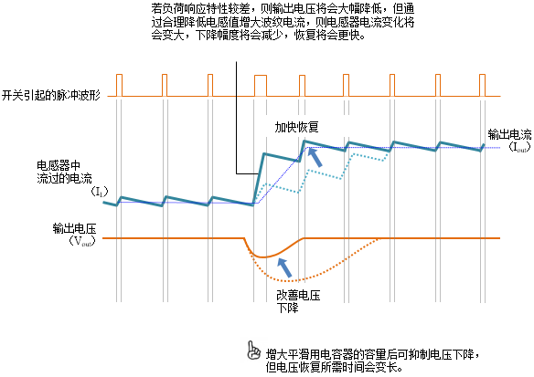 在负荷剧增等情况下,输出电压会下降,为进行恢复,功率电感器中会短时间流过过大的峰值电流,用以对负荷电流与输出电容器进行充电。在波纹电流较小的设置下,可能会无法得到为了立即从输出电压大幅下降状态下恢复所需的过渡响应特性。因此需要采取降低电感值来增大波纹电流的方法。如图6所示,若负荷响应特性较差,则输出电压将会大幅降低,但通过合理降低电感值增大波纹电流,则电感器电流变化将会变大,电压下降幅度将会减少,恢复将会更快。但降低电感值时,在综合考虑平衡的情况下进行设置十分重要。