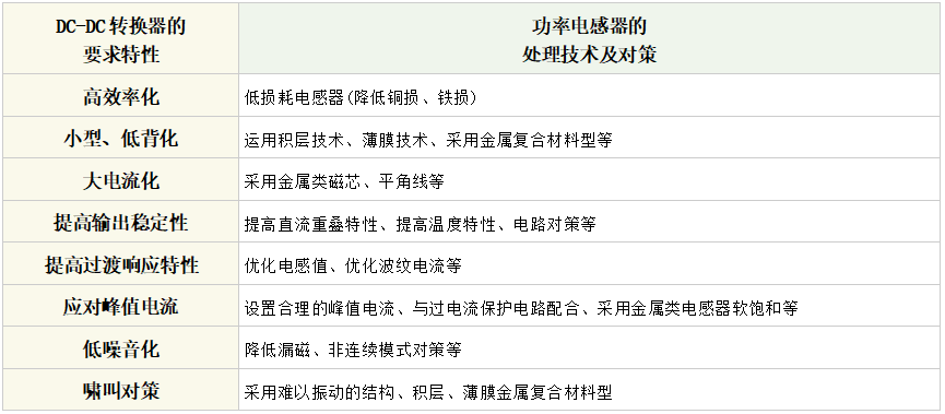 下表总结了DC-DC转换器的要求特性及其相关的功率电感器特性