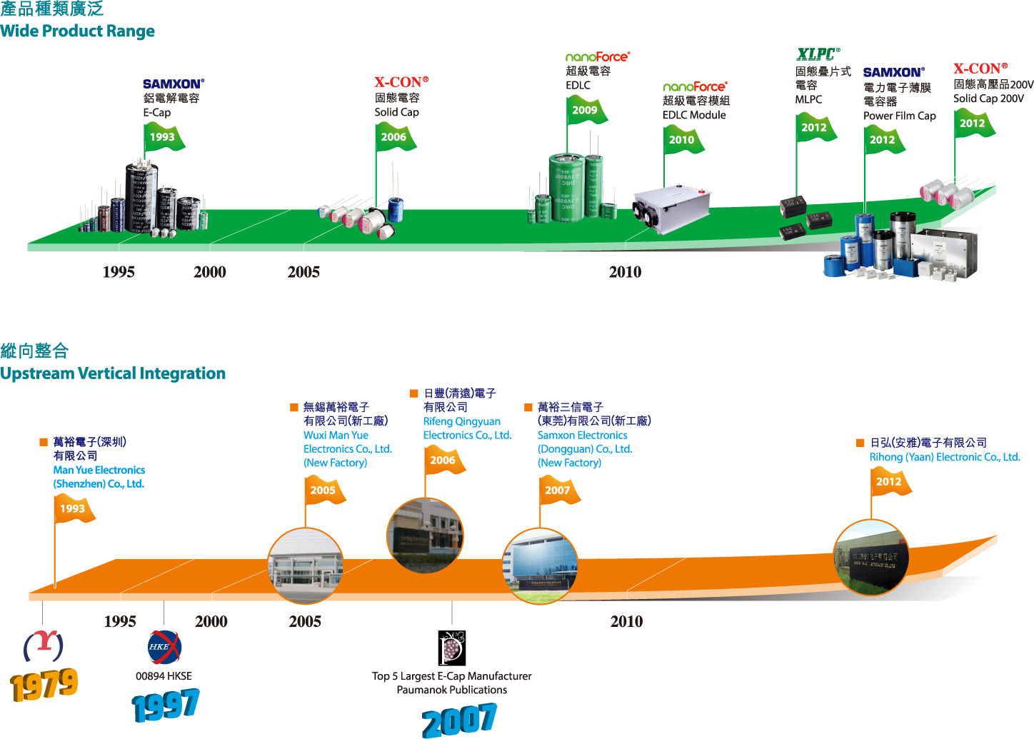 作为全球主要铝电解电容器及高分子电容器制造商,该集团拥有知名SAMXON® 及X-CON®品牌。