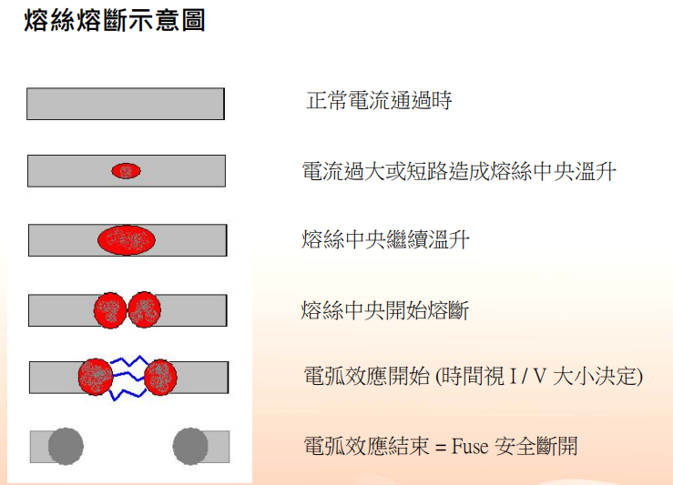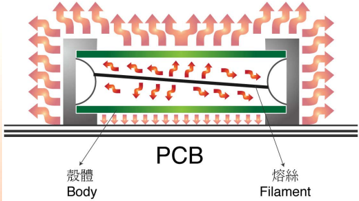保险丝(Fuse)的热平衡 一般工作时,电流流过保险丝的熔丝产生热能(W=I²Rt),透过传导/辐射将热传至殼体,渐渐与环境达到热平衡。过载或短路时,大电流使熔丝产生高温热,无法消散,破坏热平衡,熔丝逐渐升温,终致熔断。 FUSE 热平衡示意图 保险丝的分类: 表面贴装型 SMD型: 1.基板:氧化铝陶瓷基板(氧化铝含量达96%) 2.电阻本体:(Cu铜/Agg银/Sn锡)