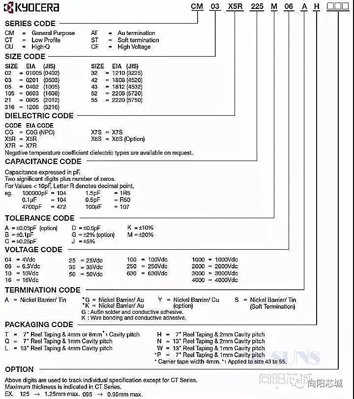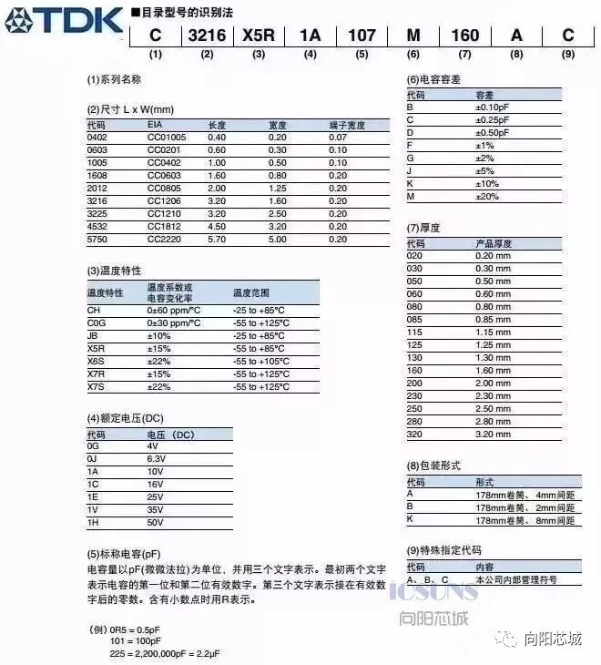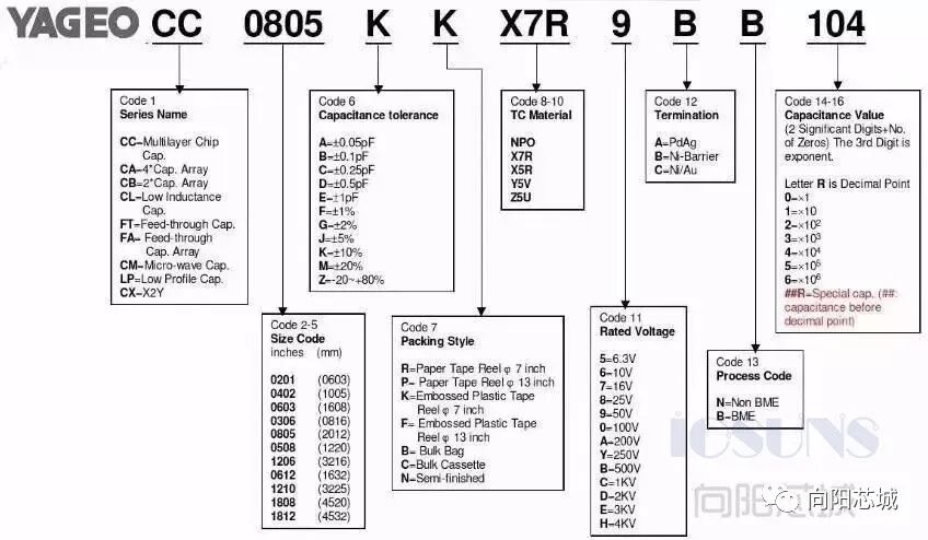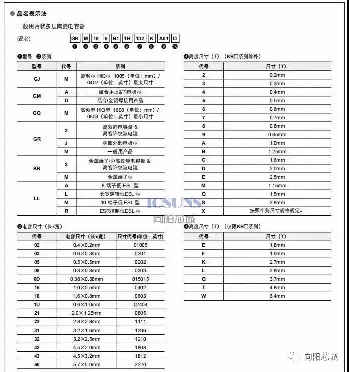 “CC”表示系列名称,即一般多层陶瓷贴片电容,例如CC0603KRX7R9BB103;(其他如AC表示车用电容,CQ表示HI-Q高频电容,CX表示X2Y®电容滤波器)。