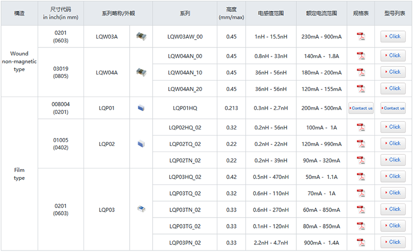 产品一览表(0.8×0.4mm以下) 点击图表中的品名,可以跳转至对象品名一览。
