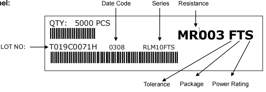 ☆注解:RLM10FTS:系列名称,r003:电阻为3mΩ(以3mΩ为例),F:公差为±1%,T:为纸质包装,s:功率为1W,lead free:无铅。 customer label:客户标签。